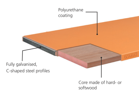 The board, whether with a softwood or hardwood core and a highly impact resistant and break-proof polyurethane coating, is characterised by its high rigidity in the face of bending forces. The other attributes of WASA WOODPLAST® also make the design comparable to hardwood boards although without the problems commonly associated with them, such as resin seepage, swelling or shrinkage tears.